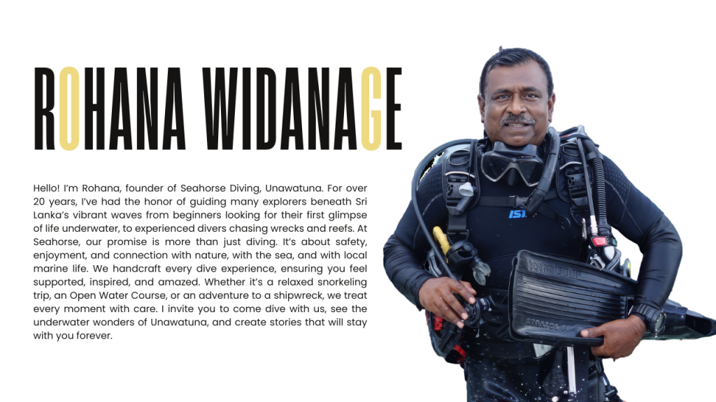 Discover the beauty beneath the waves with Seahorse Diving Unawatuna the original Unawatuna Diving Centre founded by Rohana Widanage, with over 20 years of trusted experience in creating unforgettable underwater adventures. Whether you’re a beginner taking your first breath underwater or an experienced diver seeking new depths, our certified PADI instructors ensure a safe, exciting, and unforgettable diving experience. At Seahorse Diving Unawatuna, we believe every dive tells a story of adventure, discovery, and connection with the ocean. Join us, and let’s explore the deep blue together.